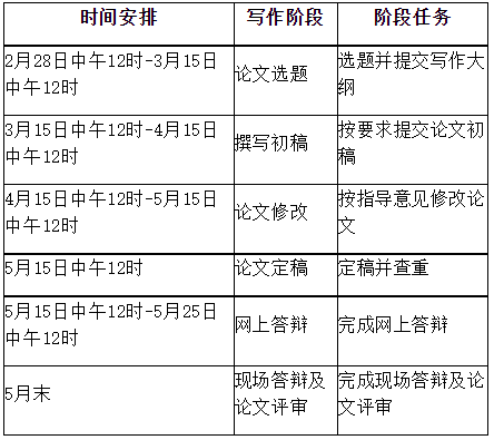 注:学院将严格按照以上时间安排开通及关闭论文平台,请提前做好时间安排,确保顺利完成各阶段任务。若因特殊原因未能按时完成阶段任务,请务必确保在5月25日(网上答辩截止日)前取得论文定稿及书面答辩的合格成绩,否则论文成绩将按不合格处理。